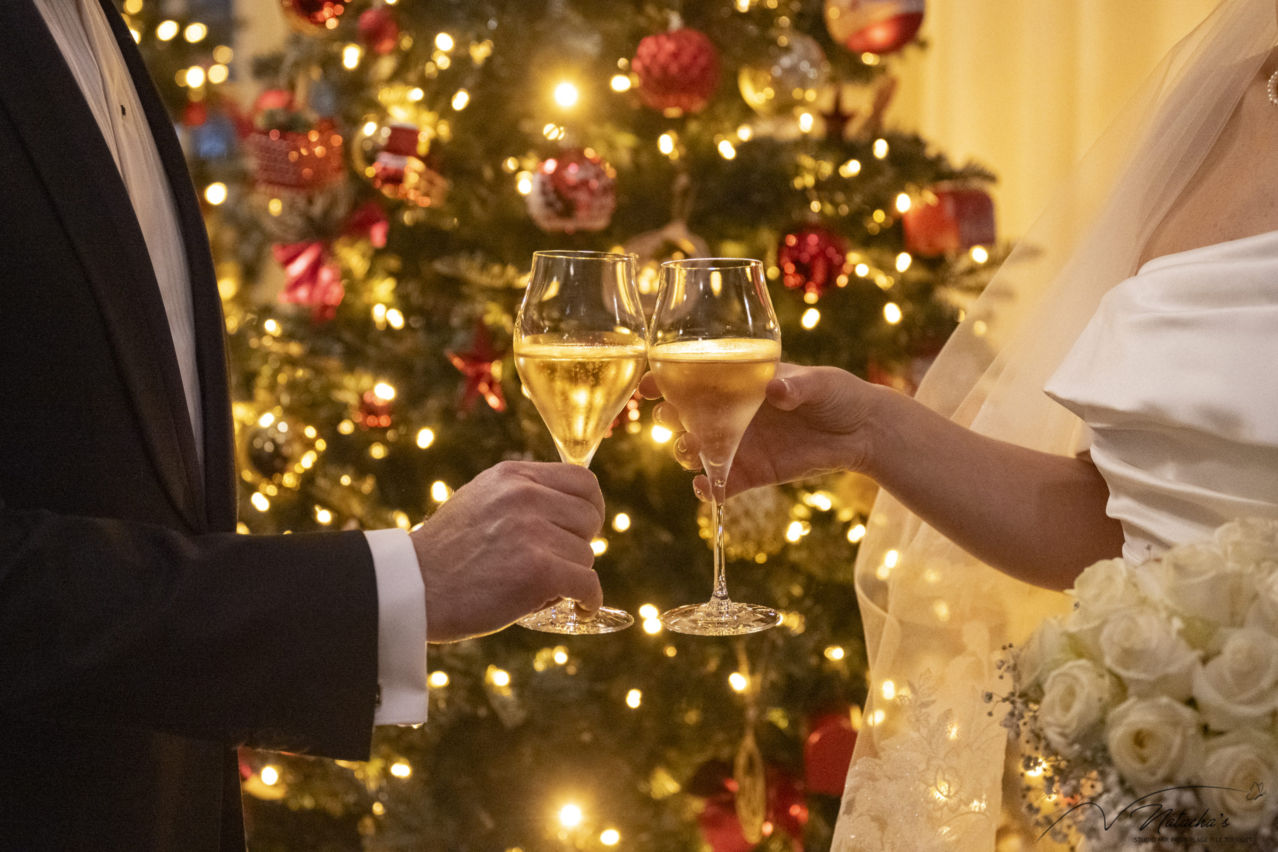 Les instants précieux entre les mariés, notamment leur toast scintillant devant le grand sapin